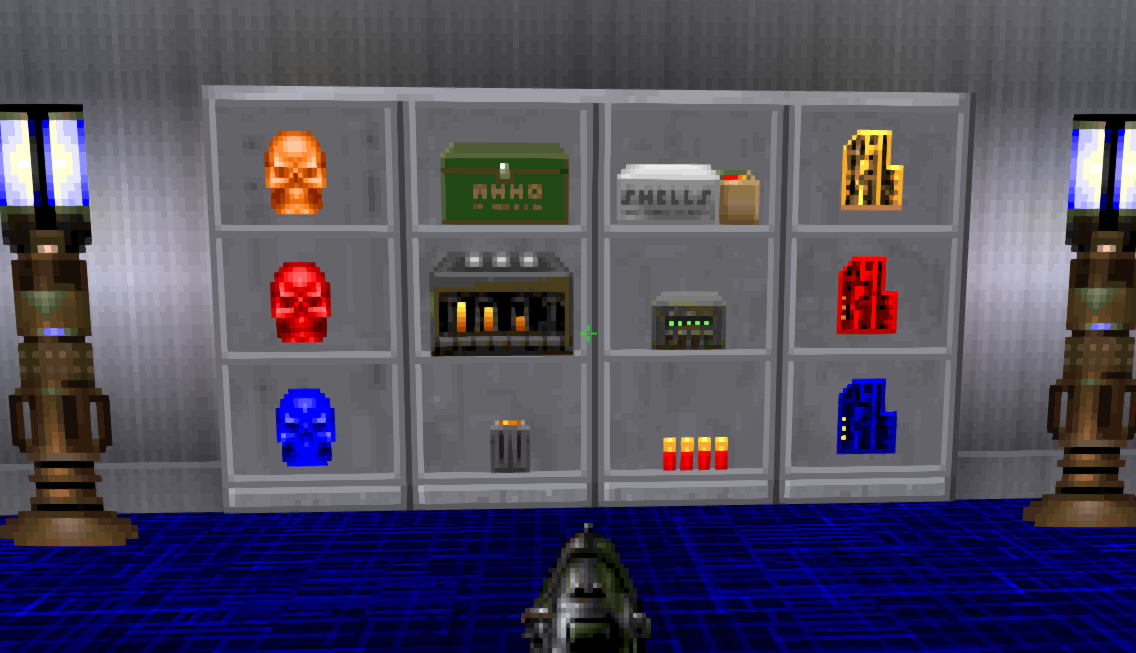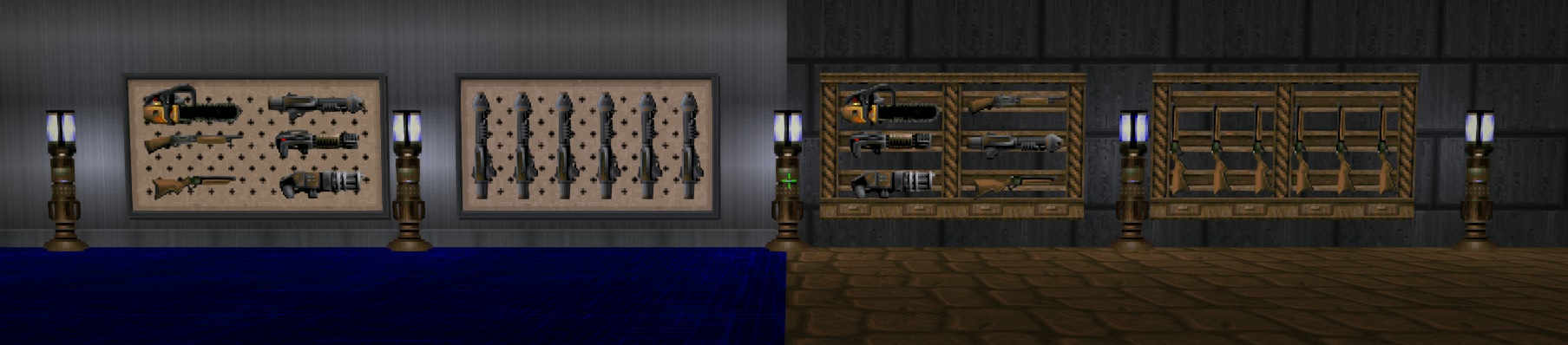 Several gunwalls, racks, shelves and pedestals which can hold inventory items such as weapons, ammo, medikits etc.
